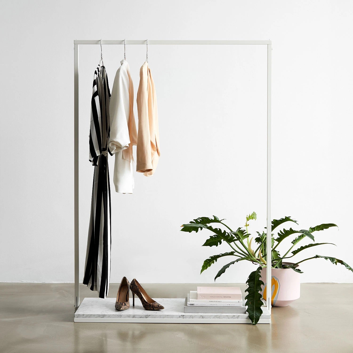 Den enkle metalkonstruktion med stænger og en eventuel hylde giver plads til både tøj og sko. Brug stativerne i dit soveværelse, din entré eller som blikfang i din stue. Frame Collections kubiske design fungerer til mange forskellige miljøer og giver dig plads til at kunne opbevare alle dine favoritter. Det er op til dig at give dit nye metal tøjstativ personlighed og karakter – præcis som på et hvidt lærred eller i en tom ramme.